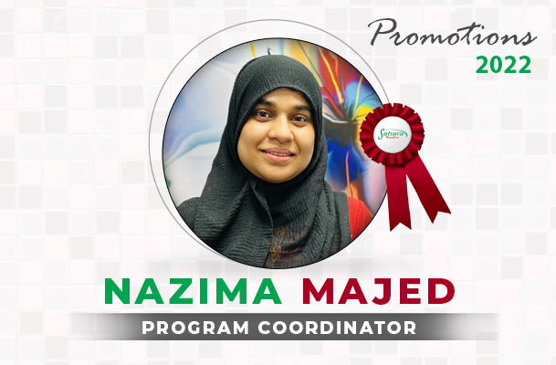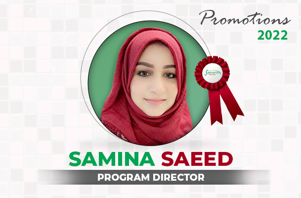 We are proud to announce a recent promotion for one of our oldest working staff members. Samina has been with Sahara for over 10 years now and has successfully taken on multiple roles. Starting out as a CCP Supervisor she has worked her way up to becoming the Program Coordinator and now recently has been promoted to Program Director. We are honored to have such devoted members of our team. Keep up the good work! - Nazima Majed- Program Coordinator