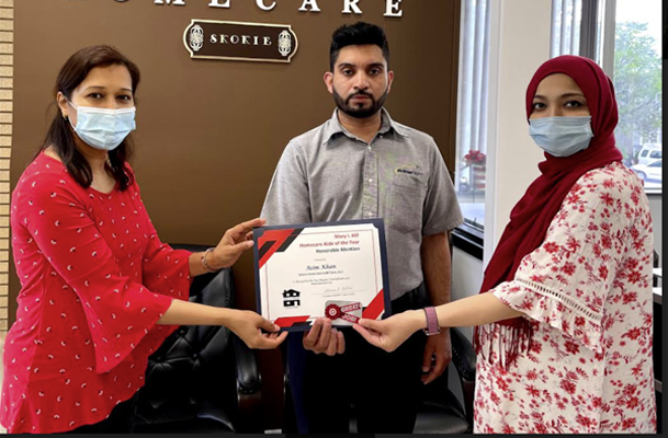 Homecare Aide Asim Khan (center) from Skokie location received an Honorable